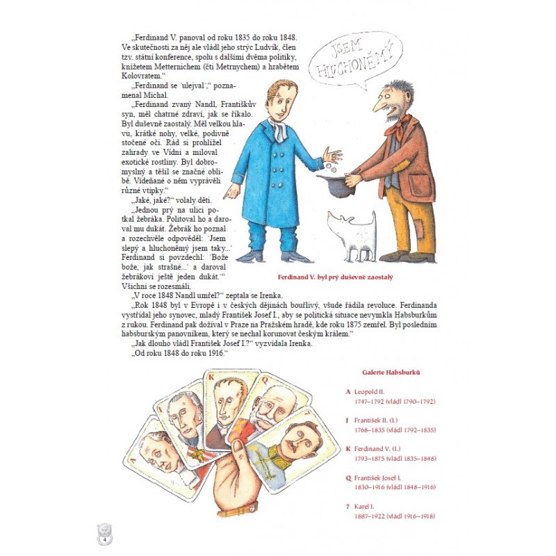 Formou vyprávění historika na penzi dvěma dětem od sousedů se dozvíte mezi historickými fakty o Františku Josefovi i klípky z jeho života, života rodinných příslušníků i dobových postav. V řadě deseti sešitů jsou zpracovány jednotlivé etapy českých dějin netradiční formou téměř detektivního vyprávění historika dvěma dětem různého věku. Jejich všetečné otázky umožňují konfrontovat současné smýšlení mládeže s historickými fakty, srovnávat současnost s minulostí v různých aspektech lidské činnosti (bydlení, oblékání, stravování, diplomacie atd.). Každý ze sešitů přibližuje jedno období českých dějin na konkrétní osobě panovníka, který je vylíčen se všemi lidskými vlastnostmi, příbuzenskými vztahy i kladnými a zápornými činy. Kapitoly jsou obohaceny barevnými a často humornými ilustracemi, které však vždy vycházejí z historických předloh.