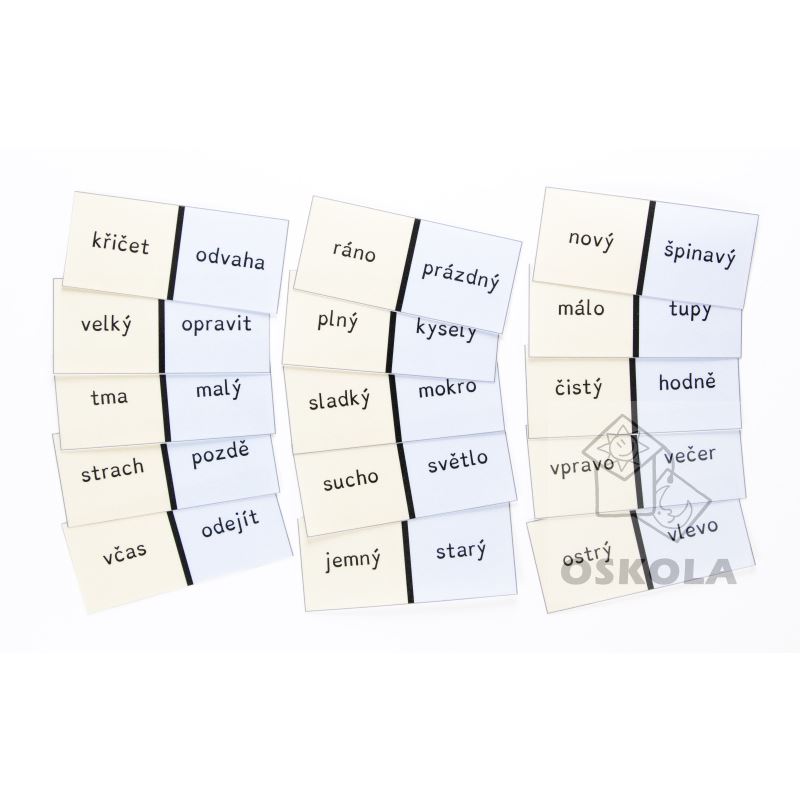 Domino s protiklady. Protiklady jsou vyobrazeny slovně. Sada obsahuje 48 kartiček.