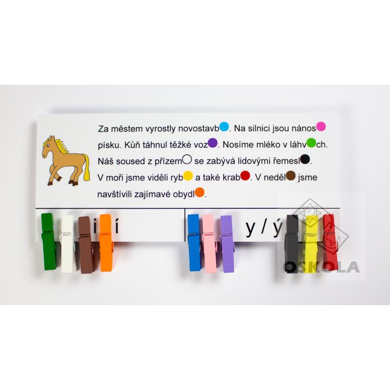 Doplňovačky, diktáty a další pravopisná cvičení se někdy pro děti stávají naprosto nezajímavými a nezáživnými. Naše sady Doplňovačky s barevnými kolíčky mohou velmi zábavnou formou procvičovaní pravopisných jevů ulehčit. Na kartičce je text, ve kterém je 10x vynecháno i/y. Úkolem je umístit kolíček příslušné barvy na správné i/y . Po otočení kartičky si děti mohou zkontrolovat správnou odpověď.