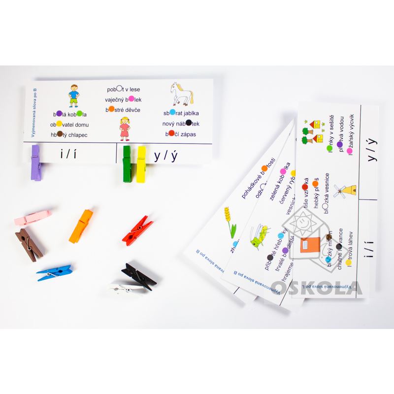 Doplňovačky, diktáty a další pravopisná cvičení se někdy pro děti stávají naprosto nezajímavými a nezáživnými. Naše sady Doplňovačky s barevnými kolíčky mohou velmi zábavnou formou procvičovaní pravopisných jevů ulehčit. Na kartičce je text, ve kterém je 10x vynecháno i/y. Úkolem je umístit kolíček příslušné barvy na správné i/y . Po otočení kartičky si děti mohou zkontrolovat správnou odpověď.