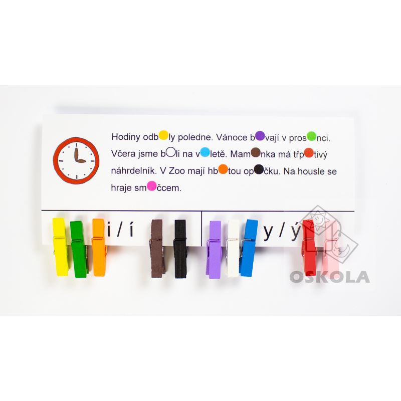 Doplňovačky, diktáty a další pravopisná cvičení se někdy pro děti stávají naprosto nezajímavými a nezáživnými. Naše sady Doplňovačky s barevnými kolíčky mohou velmi zábavnou formou procvičovaní pravopisných jevů ulehčit. Na kartičce je text, ve kterém je 10x vynecháno i/y. Úkolem je umístit kolíček příslušné barvy na správné i/y . Po otočení kartičky si děti mohou zkontrolovat správnou odpověď.