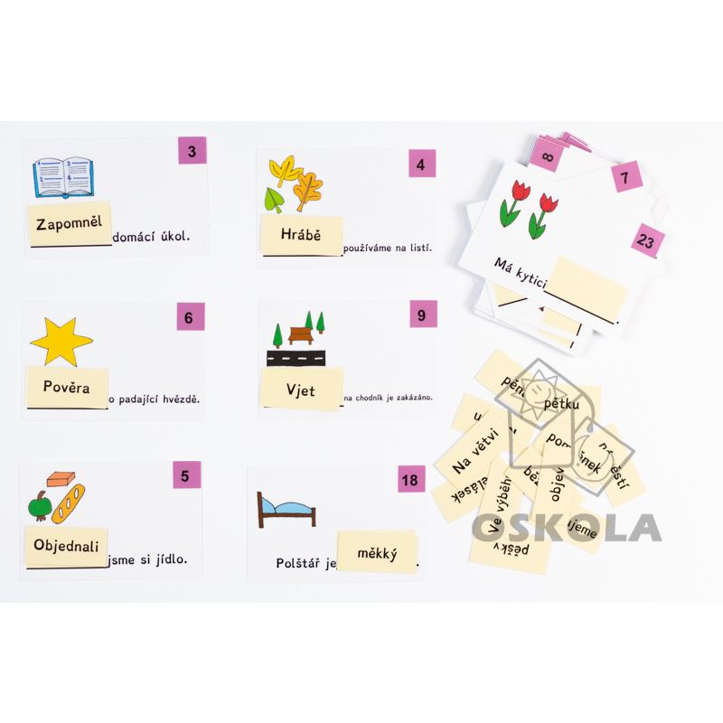 Sada obsahuje 24 velkých kartiček s neúplnými větami a 24 malých kartiček se slovy obsahujícími tyto koncovky. Navíc sada obsahuje 4 velké karty, kde jsou anpsané všechny věty.