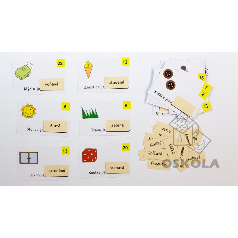 Sada je určena pro učení hrou a pomáhá dětem lépe porozumět použití přídavných jmen v kontextu vět. Obsahuje 24 velkých kartiček s neúplnými větami a 24 malých kartiček s přídavnými jmény, které děti doplňují do vět. Kromě toho obsahuje 4 velké karty s kompletními větami pro kontrolu.