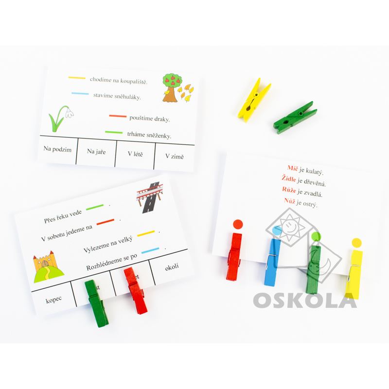 Sada obsahuje 20 kartiček, na každé kartičce jsou 4 věty a v každé větě je vynecháno jedno slovo nebo slovní spojení. Úkolem je vybrat ze spodní části kartičky slovo k doplnění a označit jej kolíčkem příslušné barvy.