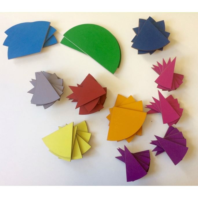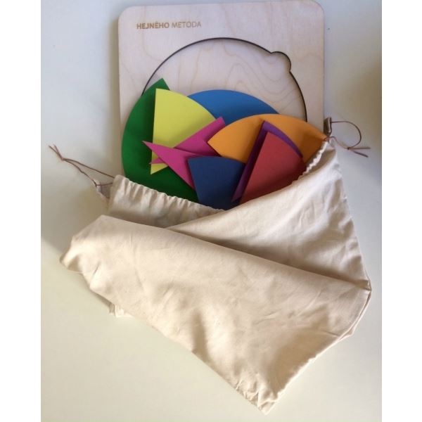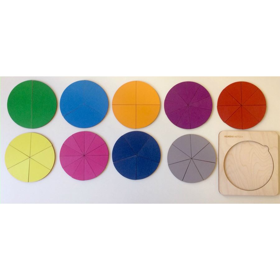 Sada obsahuje 9 různobarevných dřevěných kruhů o průměru 20cm, rozdělených na poloviny, třetiny, čtvrtiny, pětiny, šestiny, sedminy, osminy, desetiny, dvanáctiny. Součástí sady je dřevěná tabulka s kruhovou výsečí, kam se jednotlivé dílky zlomku vkládají. Vše je baleno do látkového pytlíku, který se zavírá zatáhnutím šňůrek. Rozměr: 290 x 290 x 70 mm