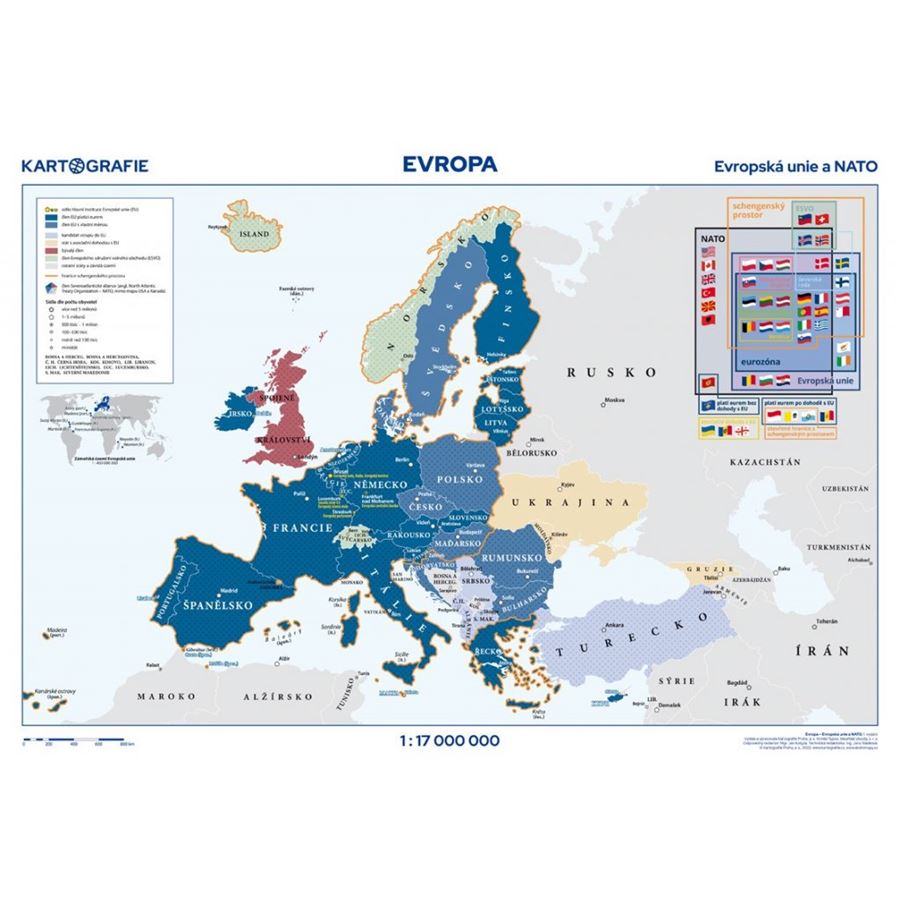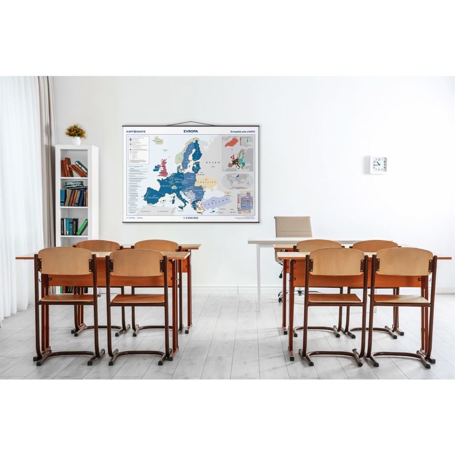 Nástěnná mapa v moderním a přehledném designu zobrazuje historii a současnost evropské integrace. Mapa je ideální pomůckou pro žáky při orientaci v současném dění, kdy se blíží české předsednictví v Evropské unii.