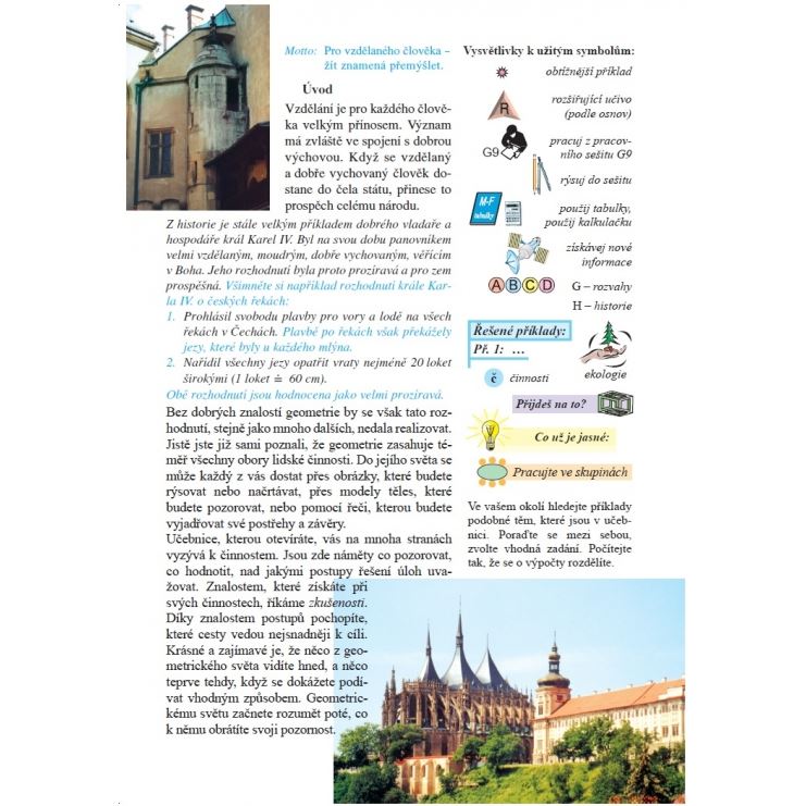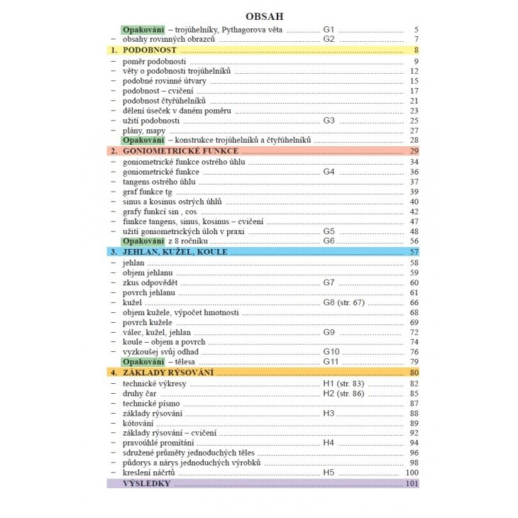 Obsahuje kapitoly učebnice: Podobnost, Goniometrické funkce sinus a tangens v pravoúhlém trojúhelníku, Jehlan, Kužel, Koule. Důraz se klade na činnostní ráz učení, využití geometrie kolem nás a v praxi. V učebnici jsou shrnuty geometrické poznatky z minulých ročníků. Nabízí možnosti zajímavého prověřování nabytých znalostí. Pozornost se také věnuje mezipředmětovým vztahům.