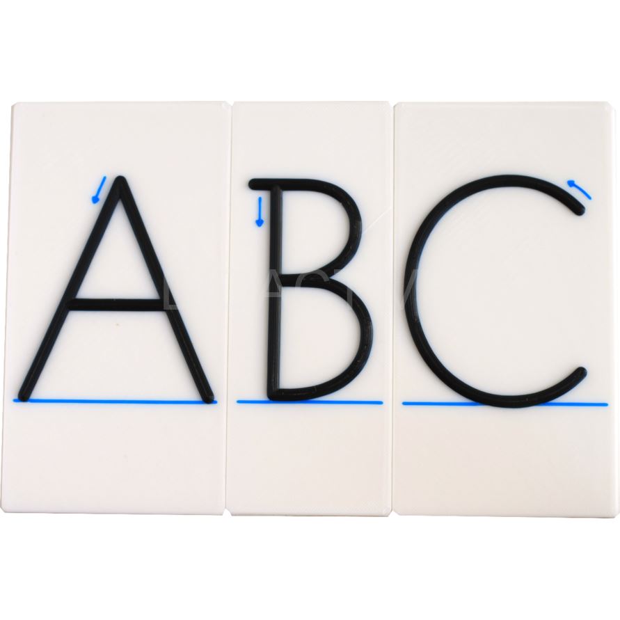 Destičky jsou bílé o výšce 140mm a šířce odpovídající šířce daného písmene. Na každé destičce je písmeno, které vystupuje cca 2mm nad povrch destičky. Je proto snadné prstem sledovat jednotlivé tahy, které písmeno tvoří. Na destičce je modře vyznačena hlavní linka a šipka určující počátek a směr prvního tahu.