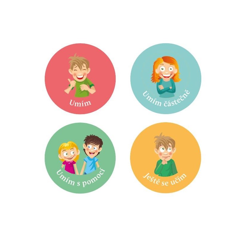 Samolepky vyjadřují stupeň hodnocení – umím, umím částečně, umím s pomocí, ještě se učím. Ke každému stupni hodnocení jsou v balení vždy 2 archy samolepek.