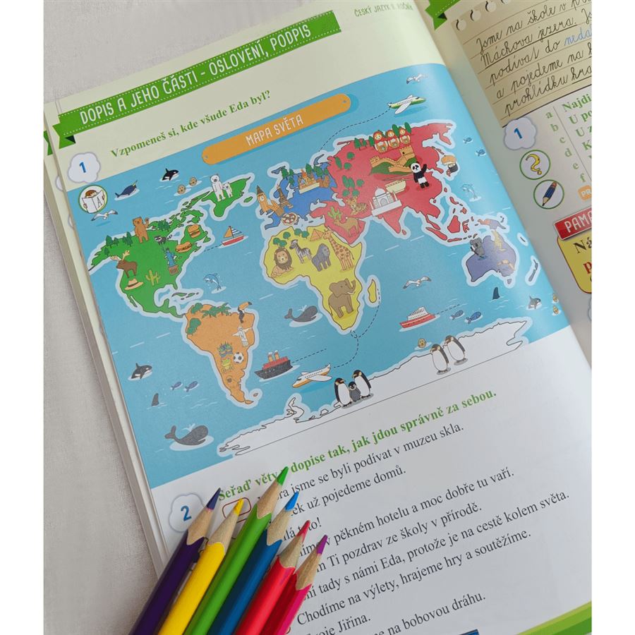 Poutavý centrální příběh zaměřený na cestu kolem světa. Úkoly, které rozvíjí zájem dětí o učivo. Práce s komiksy a dalšímy ilustracemi. Deskové a jiné hry (pexesa, jazykolamy, labyrinty). Hravé úlohy k vystřihování a nalepování karet.