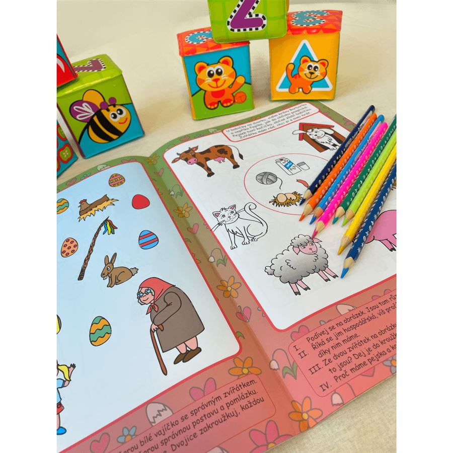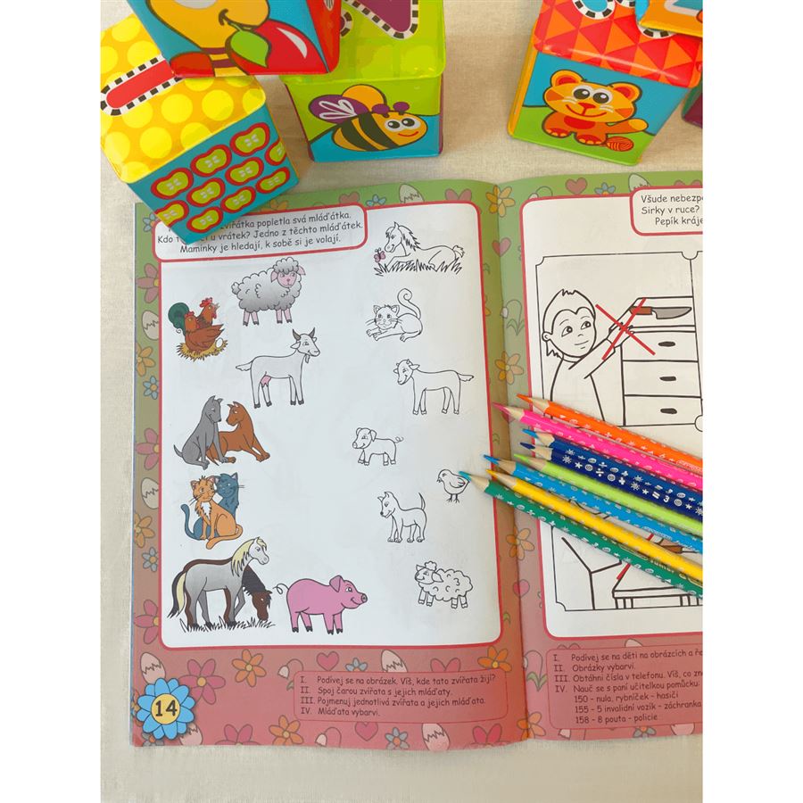 •1. Rodina – sociální učení•2. Školka – sociální učení•3. Roční období – časová orientace•4. Stromy – zrakové vnímání a přiřazování•5. Ovoce a zelenina – zraková analýza•6. Denní činnosti – časová posloupnost•7. Čert a Mikuláš – zrakové vnímání•8. Vánoce – vyjadřovací schopností, povědomí o zvycích•9. Nemoc – přiřazování•10. Tělo – prostorová představivost, přiřazování•11. Zdravé a nezdravé potraviny - prostorová orientace, přiřazování•12. Velikonoce – zrakové vnímání, povědomí o zvycích•13. Domácí zvířata – přiřazování•14. Zvířátka a mláďátka – přiřazování•15. Nebezpečné situace – poznávání•16. Z čeho se co vyrábí – poznávání, přiřazování•17. Profese – zrakové vnímání a přiřazování•18. Ekologie – vyjadřovací schopnosti, zraková analýza•19. Maminka – vyjadřovací schopnosti, sociální učení•20. Zvířátka u vody – zraková analýza, přiřazování•21. Exotická zvířátka – prostorová orientace, přiřazování•22. Dopravní výchova – prostorová orientace•23. Dopravní prostředky – zraková analýza, přiřazování•24. Prázdniny – zrakové vnímání, rozvoj pozornosti