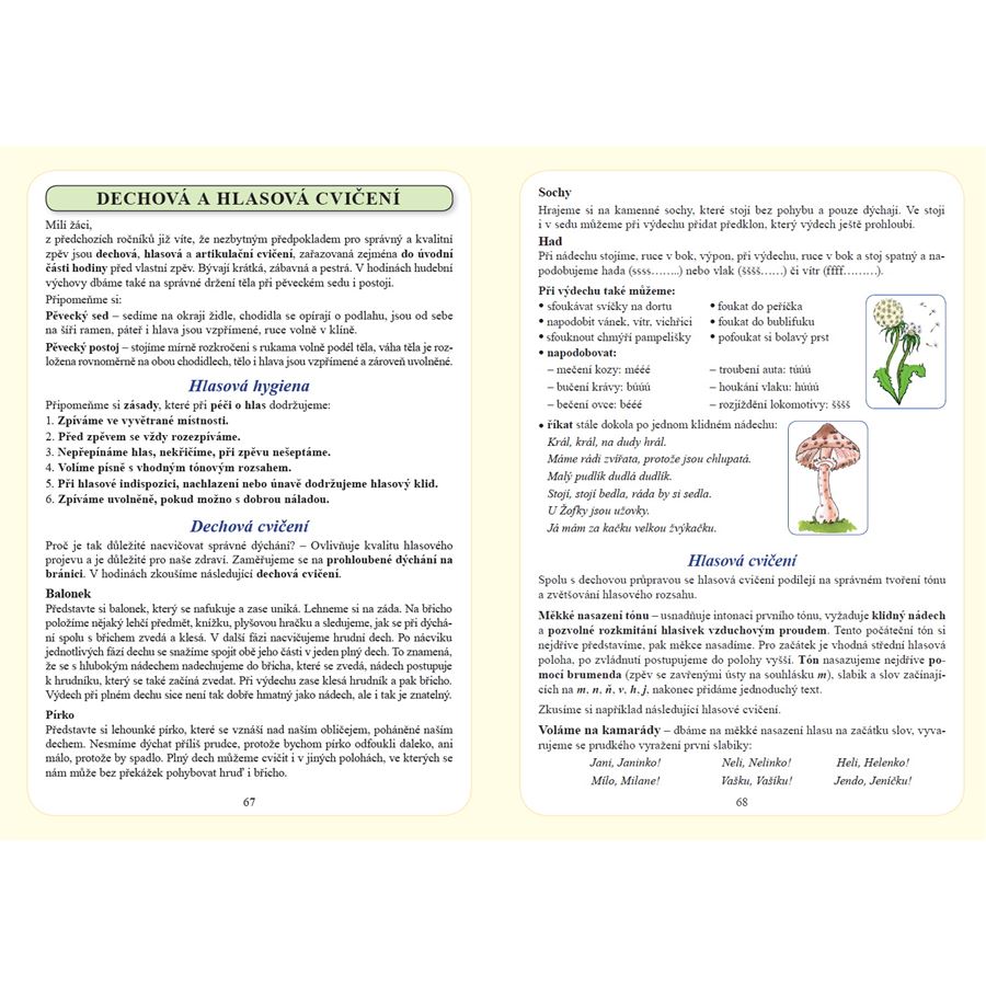 V učebnici najdete i dechová, hlasová a artikulační cvičení, která by se měla stát nezbytnou součástí každé hodiny hudební výchovy. Pro větší přehlednost je učivo rozděleno do jednotlivých měsíců a dále do kapitol. Ty jsou často uvedeny motivačním příběhem, který promlouvá prostřednictvím průvodce učebnicí – slavíka Otíka.