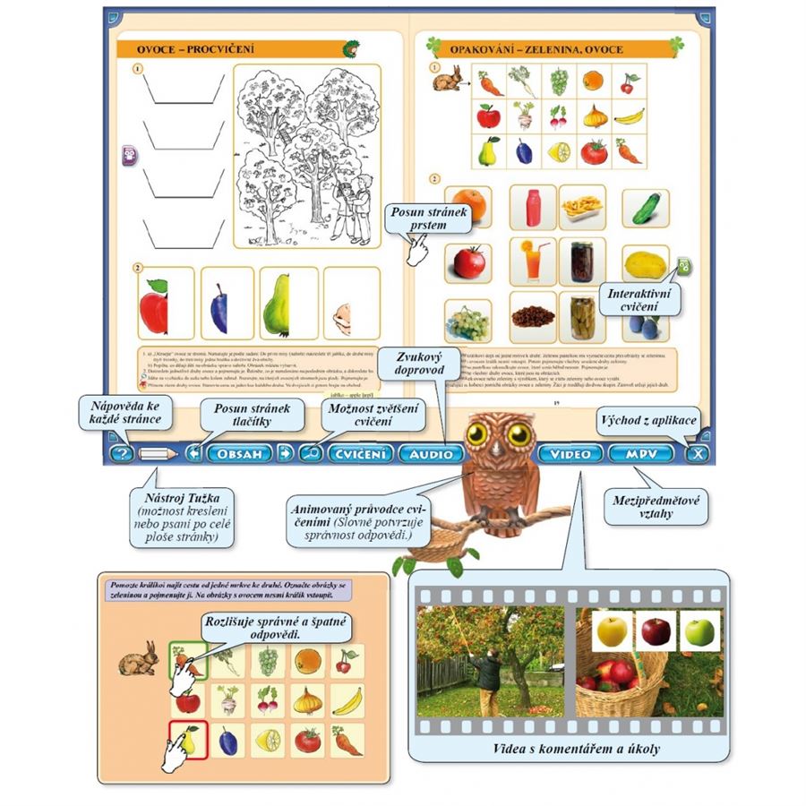 Obsahuje 23 interaktivních cvičení. Provází animovaná sova Áda, která odměňuje děti hvězdičkami. Zvukový doprovod na každé straně. Video nahrávky s mluveným doprovodem. Mezipředmětové vztahy. Možnost zvětšení jednotlivých cvičení. Snadná navigace a intuitivní přístup.