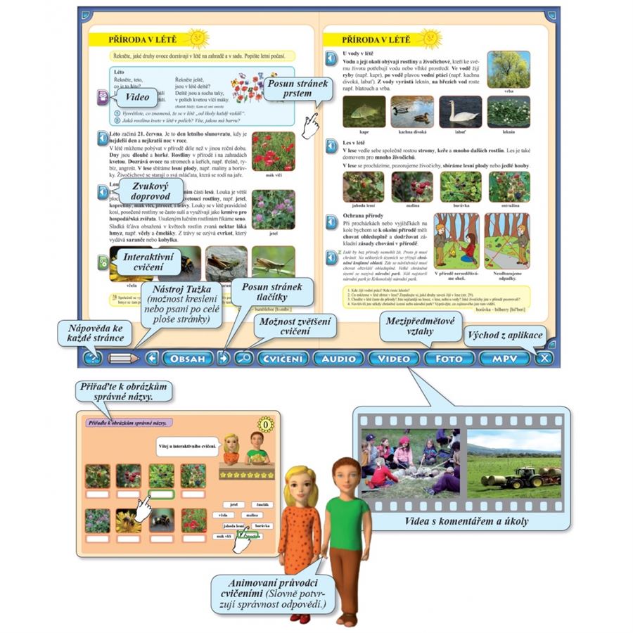 Provází animované postavy Jany a Lukáše, kteří odměňují děti hvězdičkami. Obsahuje 23 interaktivních cvičení; zvukový doprovod na každé straně; video nahrávky s mluveným doprovodem; mezipředmětové vztahy; ožnost zvětšení jednotlivých cvičení. Součástí je také snadná navigace a intuitivní přístup.