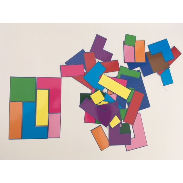 Základní dílek je o velikosti 2,5 x 2,5 cm. Jednotlivé dílky jsou v různých barvách.