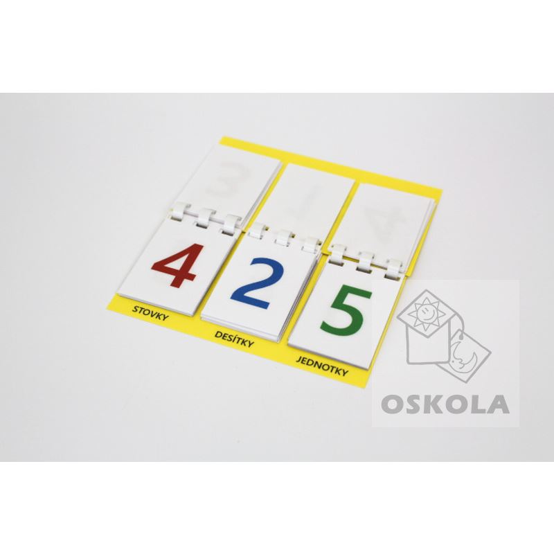 Knížečka s plastovou vazbou obsahující čísla od nuly do 999. Stovky, desítky a jednotky jsou barevně odlišeny.
