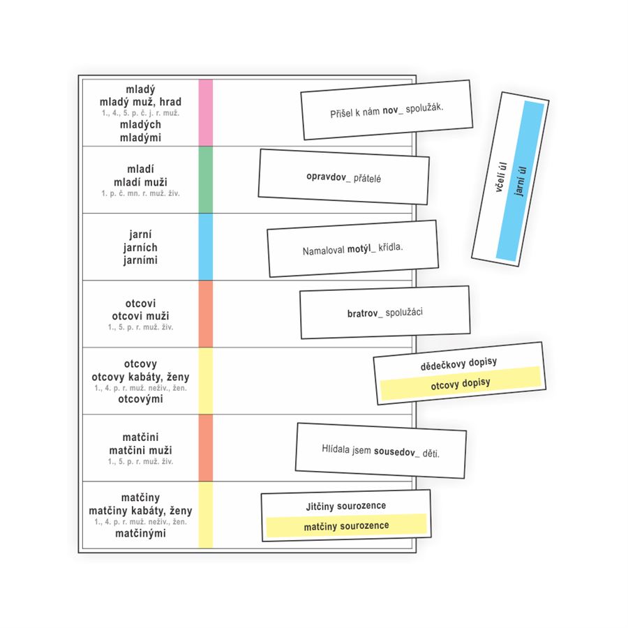 Kartičky k procvičování psaní I, Í, Y, Ý v koncovkách přídavných jmen a k procvičování vzorů mladý, jarní, otcův a matčin. K sebekontrole je určena barevná strana.