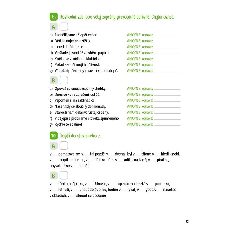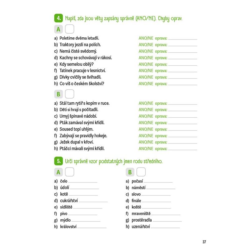 Hledáte krátká a zábavná zadání, která nezaberou moc času, ale skvěle poslouží k procvičení látky, která dětem nejde nebo si ji potřebují upevnit? Pak sáhněte po naší cvičebnici! Najdete zde úkoly na procvičování psaní předpon, vyjmenovaných slov, slovních druhů, koncovek podstatných jmen, pravopisu přídavných jmen, zájmen, číslovek i sloves. Jejich vyplnění nezabere více než pět až deset minut. Některé úlohy jsou rozděleny na část A a B, takže je mohou využít nejen rodiče při domácí přípravě, ale i učitelé při psaní testů.