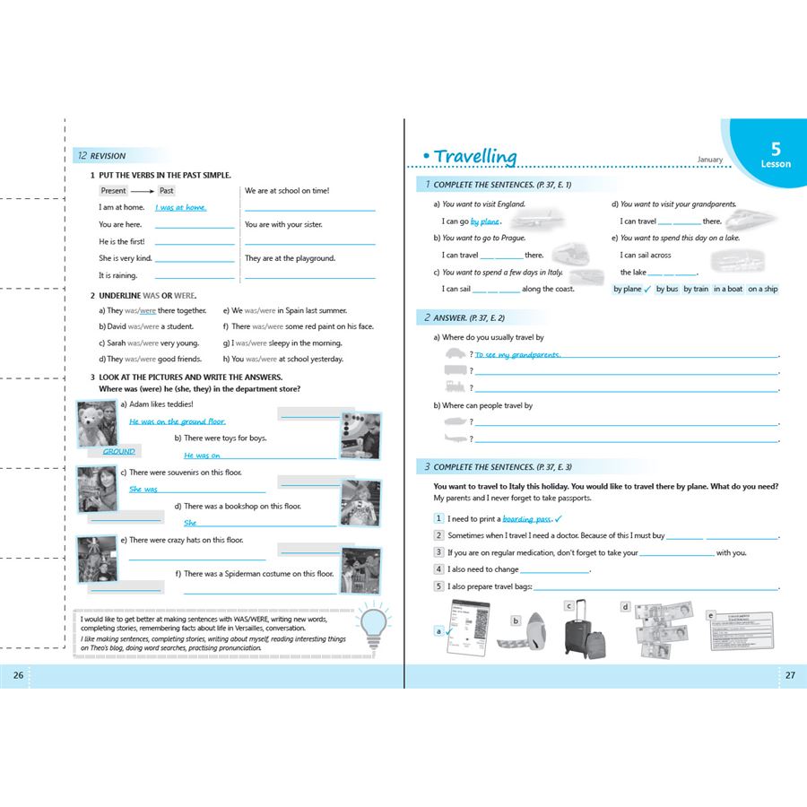 Pracovní sešity jsou dvoubarevné, cvičení v pracovních sešitech obsahují odkazy na cvičení v učebnici. Učivo každé lekce je shrnuto na opakovacích stranách v závěru lekce. K zopakování učila lze využít i opakovací strany v závěru pracovních sešitů. První díl obsahuje závěrečné opakování učiva daného pololetí, druhý díl závěrečné opakování učiva celého ročníku.Obálky pracovních sešitů jsou využity ke hře.