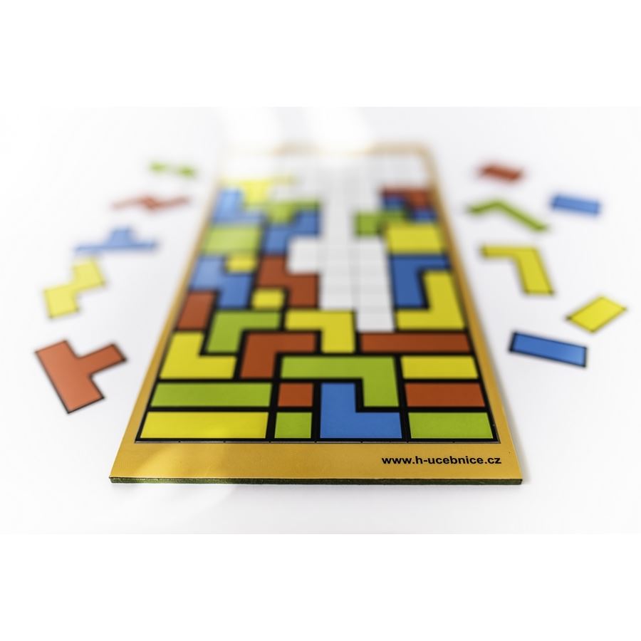 Deska má magnetický podklad (jako tabule), na kterém jednotlivé dílky drží (jako magnetky). Žáci si mohou vyznačit fixou plochu, jak velkou část podlahy budou v úloze pokrývat.