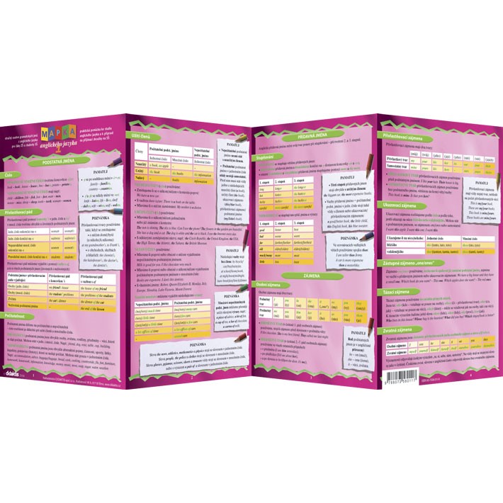 Učební pomůcka nahrazující vyhledávání poznámek v sešitech anglického jazyka – 8 přehledně zpracovaných stran tvoří 1. část přehledu nejdůležitějších poznatků z mluvnice anglického jazyka (podstatná jména, přídavná jména, zájmena, číslovky, příslovce, předložky a spojky).