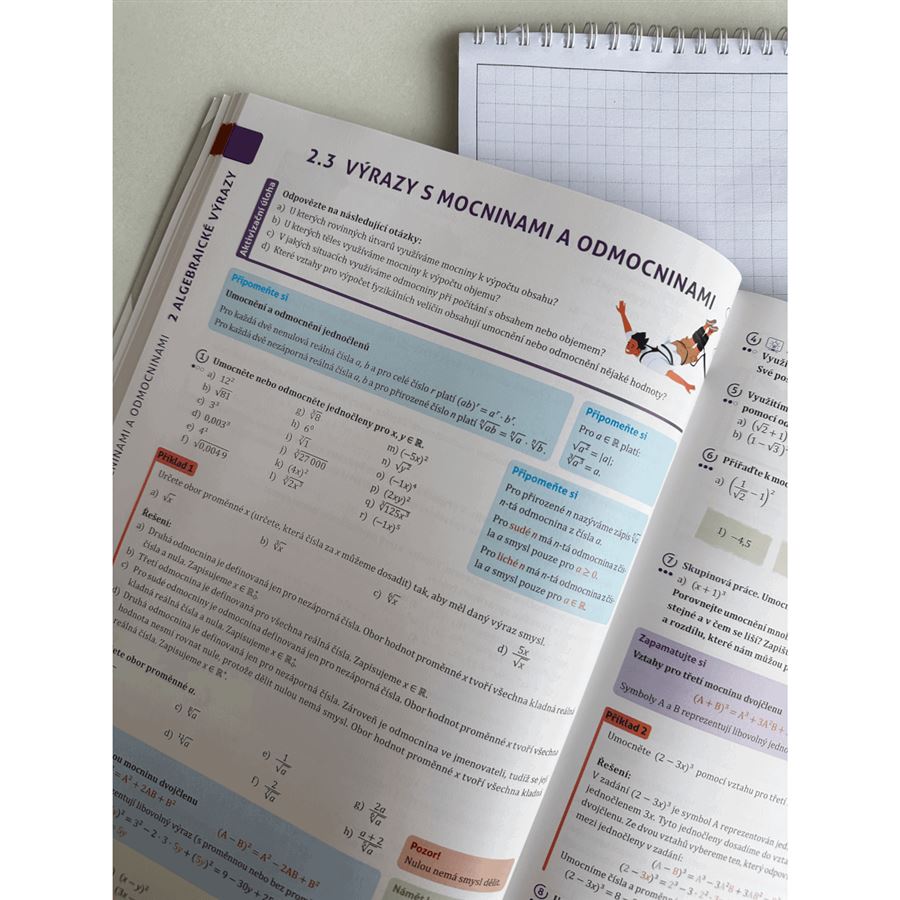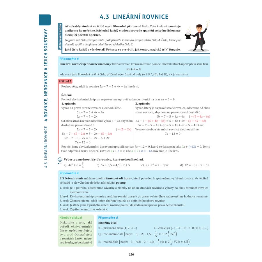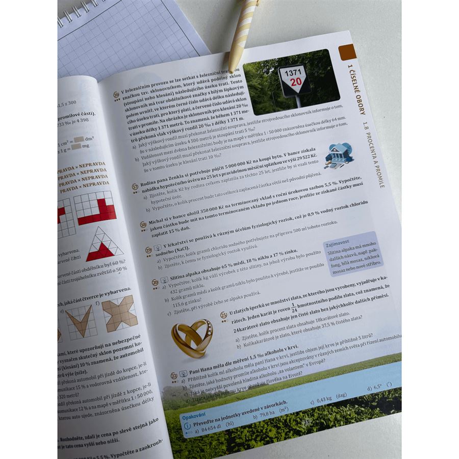 Kapitoly začínají aktivizační úlohou, která slouží jako vstupní brána do probíraného tématu. Strukturované učivo je proloženo infoboxy plnými zajímavostí a podnětů k diskuzi. Na konci každého oddílu najdete shrnutí teorie, procvičovací úlohy a testy k ověření znalostí. Každá kapitola také obsahuje rychlé opakování již probraného učiva. Mezi oddíly se nepravidelně objevují projekty, které pomáhají aplikovat matematické znalosti v praxi a propojují matematiku s jinými obory.