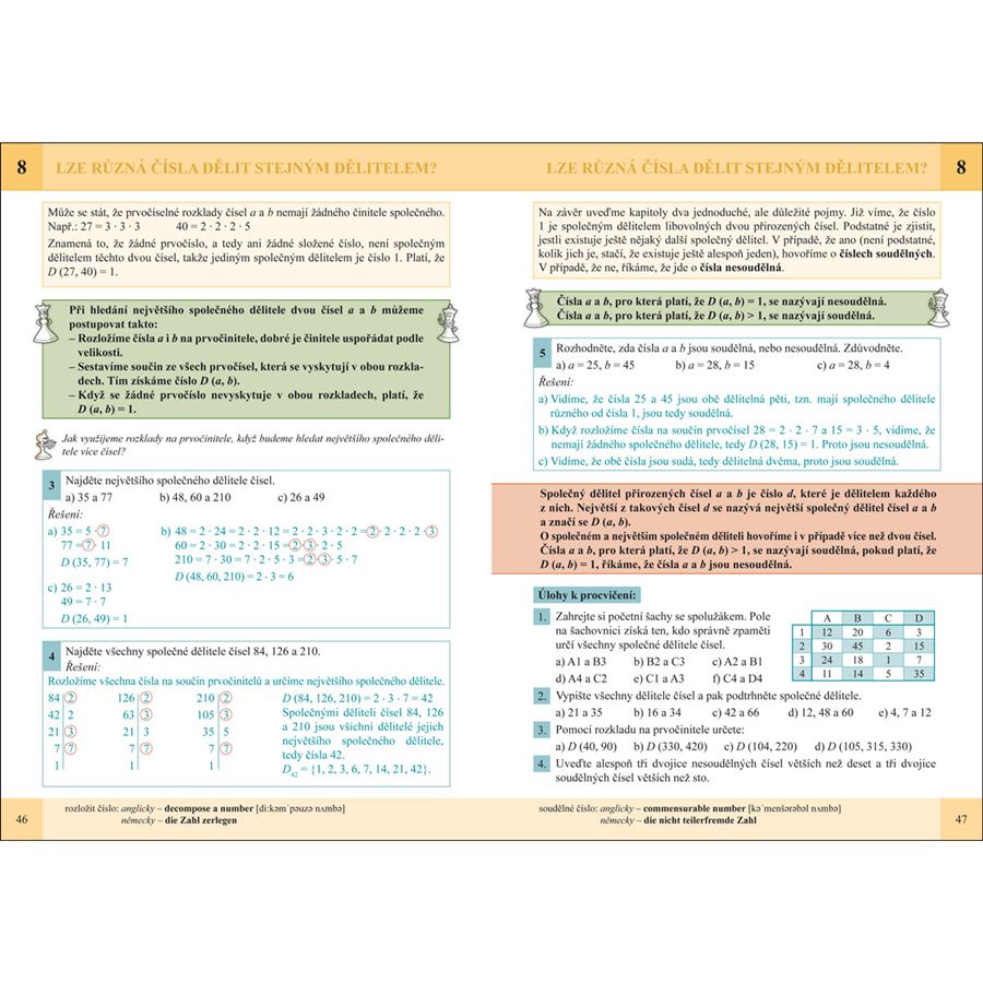 Učivo matematiky celého 2. stupně není děleno klasicky do jednotlivých ročníků, ale je rozděleno tematicky do 16 učebnic. Náplň každé učebnice přesně vychází z RVP ZV. Rozdělení látky do samostatných tematických celků vychází vstříc potřebám škol – je tak možné řadit látku individuálně podle ŠVP, který má škola zpracován. Vtomto navrženém pořadí je počítáno se čtyřmi tématy pro každý ročník. Doporučeno pro 6. ročník: Desetinná čísla – musí předcházet učebnici „Základy geometrie“ a „Kladná a záporná čísla“; Kladná a záporná čísla – musí předcházet učebnici „Zlomky, poměr“; Dělitelnost; Základy geometrie – musí předcházet učebnici „Shodnost geometrických útvarů, souměrnosti“.