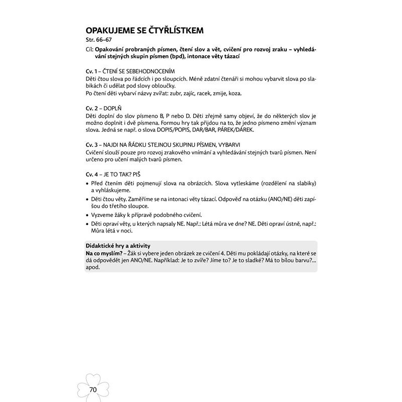 Díky ilustracím Jaroslava Němečka i veršíkům básnířky Dany Raunerové podporuje výuková sada se Čtyřlístkem fantazii žáka i učitele. Na webových stránkách knihy pak najdete ke stažení řadu dalších užitečných materiálů a také odkaz na interaktivní cvičení, která výuku vhodně doplní.