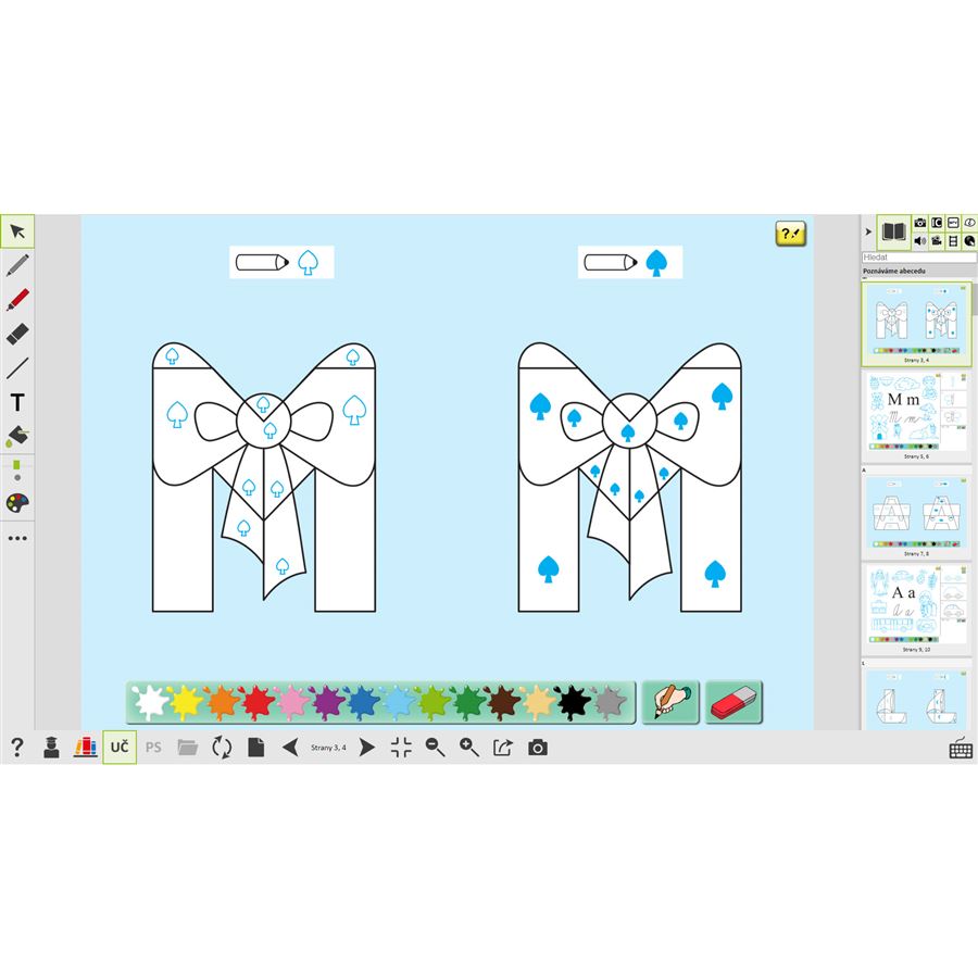 MUIč+ Poznáváme abecedu obsahuje strany shodné s tištěným sešitem převedené do interaktivní podoby. K dispozici jsou zejména nástroje kreslení a výplň, které usnadňují vybarvování obrázků.