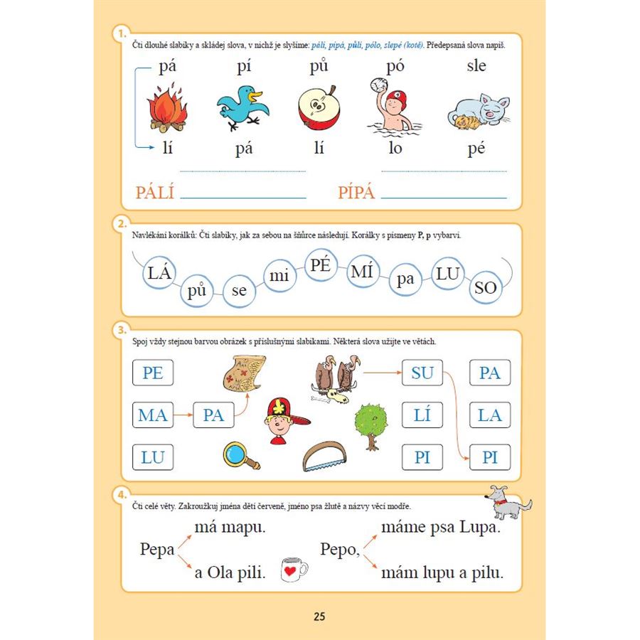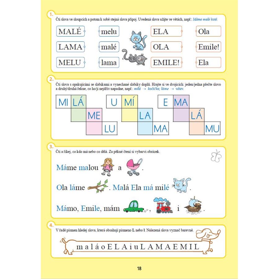 Učebnice pracuje se všemi samohláskami a se souhláskami M, L, S, P, T, J, které jsou voleny s ohledem na jejich frekvenci a snadnost osvojení v počáteční fázi čtení. Vedle techniky čtení je systematicky rozvíjeno také porozumění čtenému, které je klíčovým základem pro další práci s textem i pro budování pozitivního vztahu ke čtení.