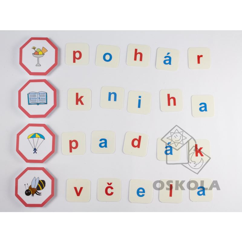 Každá sada obsahuje 24 obrázků a písmenka, která jsou rozdělena podle barvy - samohlásky jsou modře a souhlásky červeně. Tato barevná diferenciace pomáhá dětem lépe porozumět stavbě slov a usnadňuje jim rozlišování mezi různými typy písmen.
