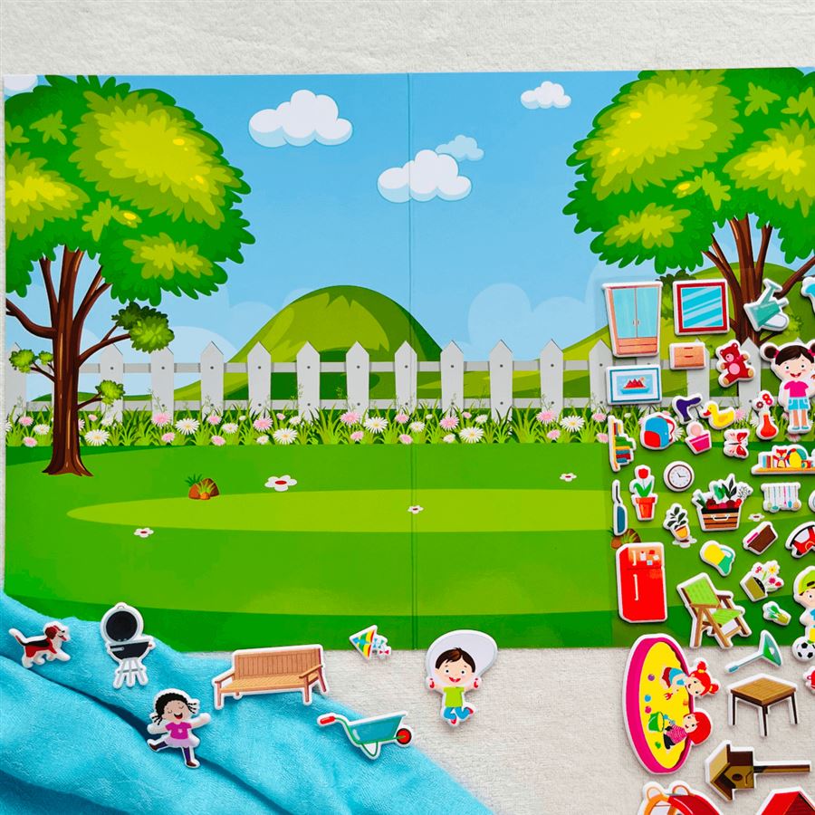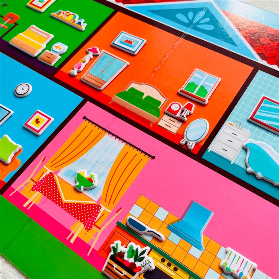 Roztomilá příběhová sada obsahuje oboustranné A3 pozadí se scenériemi pokojů v domě a jeho zadního dvoru a několik desítek znovu nalepovacích 3D pěnových samolepek.