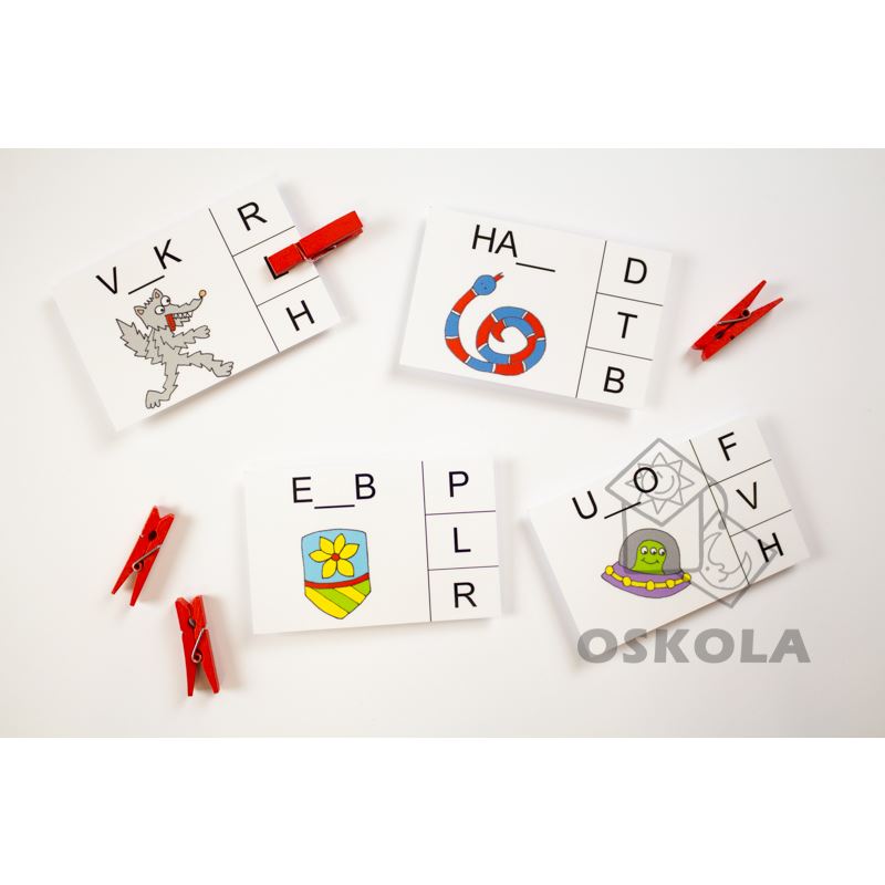 Každá sada obsahuje 24 kartiček. Na kartičce je obrázek a neúplné slovo. Děti mají za úkol vybrat správnou odpověď k doplnění slova a na tuto odpověď umístit kolíček. Po otočení kartičky si mohou svoji odpověď zkontrolovat.