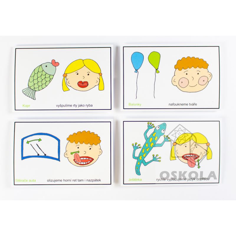 Na kartičkách jsou znázorněny cviky pro zlepšení motoriky mluvidel. Díky kartičkám mohou děti provádět oromotorická cvičení zábavnou formou. Oromotorická cvičení jsou důležitá pro správnou pohyblivost mluvidel. Pokud by byla jakkoliv omezená, nebylo by možné hlásku správně vyslovit.