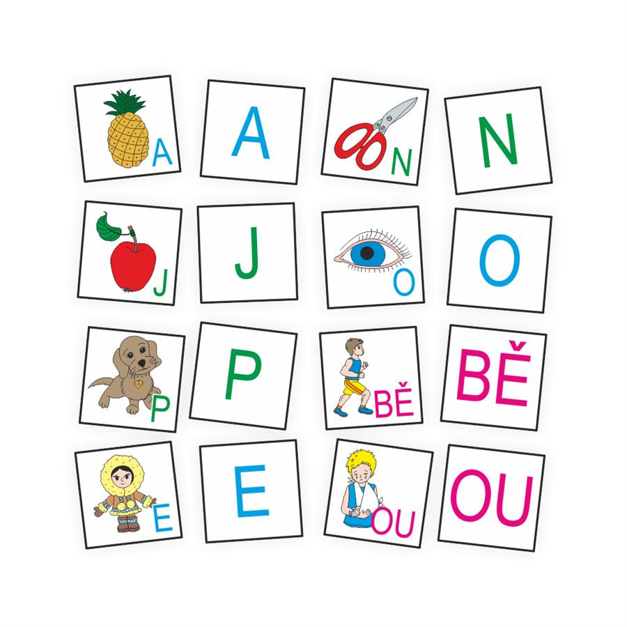Dvojice pexesa tvoří písmeno a obrázek s písmenem. Dítě se učí přiřadit jedno písmeno k jednomu obrázku. Musí analyzovat první hlásku z obrázku a hledat k tomu příslušné písmeno.