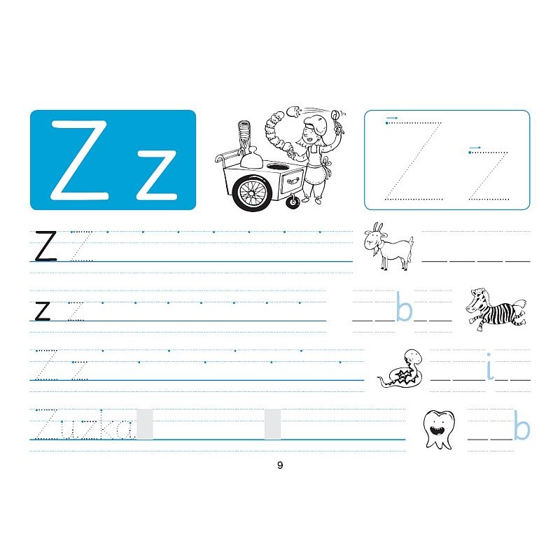 Součástí jsou obrázkové doplňovačky a tabulka k odstřižení s obrázkovou abecedou nevázaného písma.