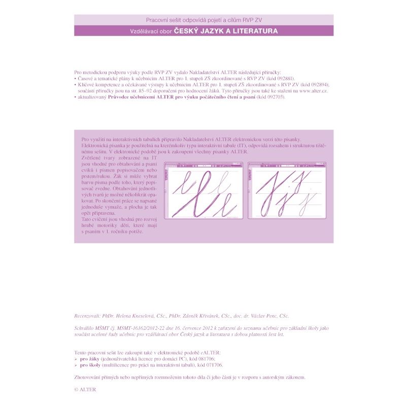 Seznamuje žáky s psacím písmem a číslicemi v rozsahu Živé abecedy a Matematiky č. 1 a 2 ALTER.