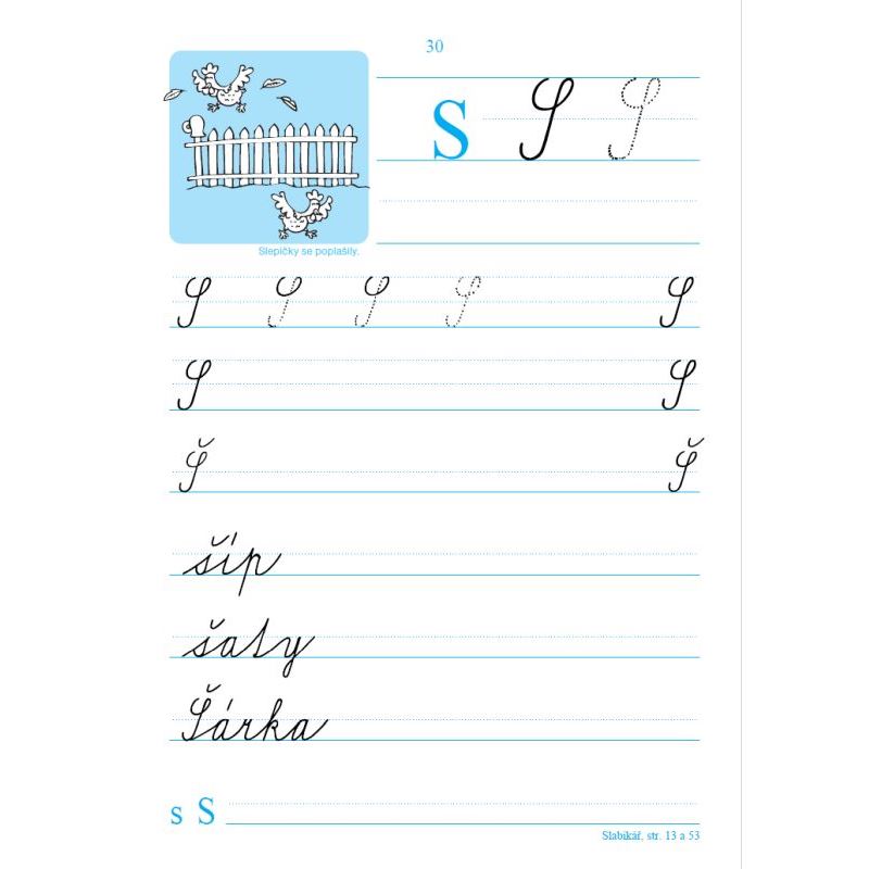 pomocnou linkovanou podložku pro psaní a tabulku s tiskacími a psacími písmeny.