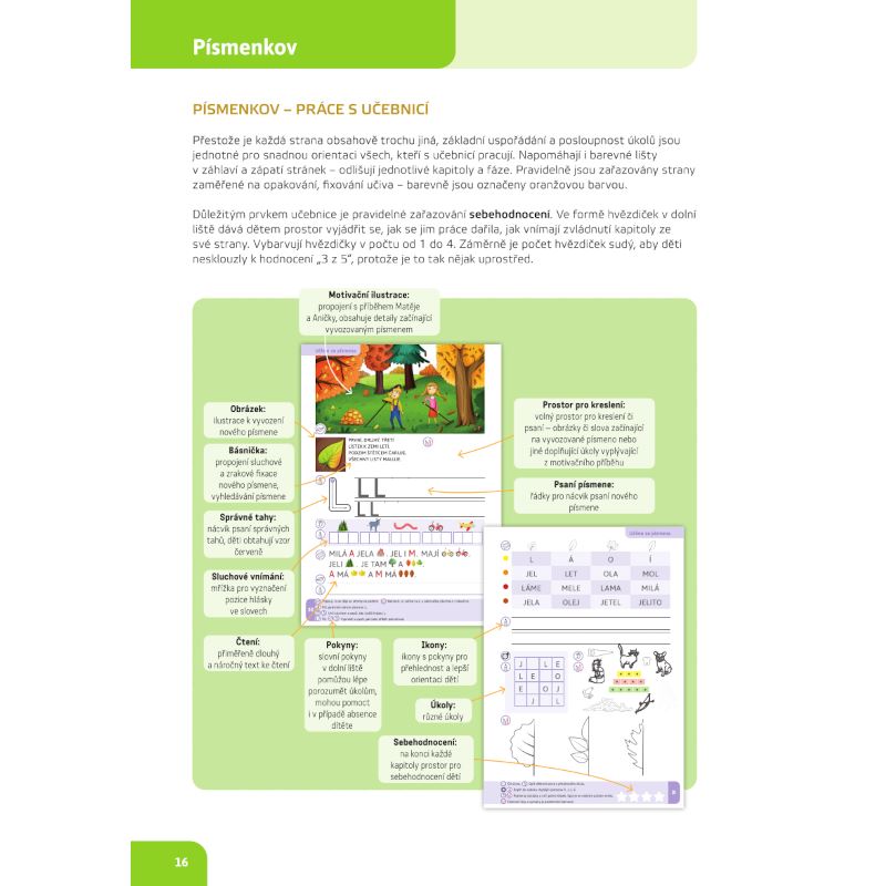 Metodická příručka navíc nabízí příběhy Matěje a Aničky, které lze dětem předčítat jako motivaci při vyvozování jednotlivých písmen v Písmenkově.