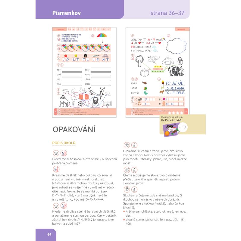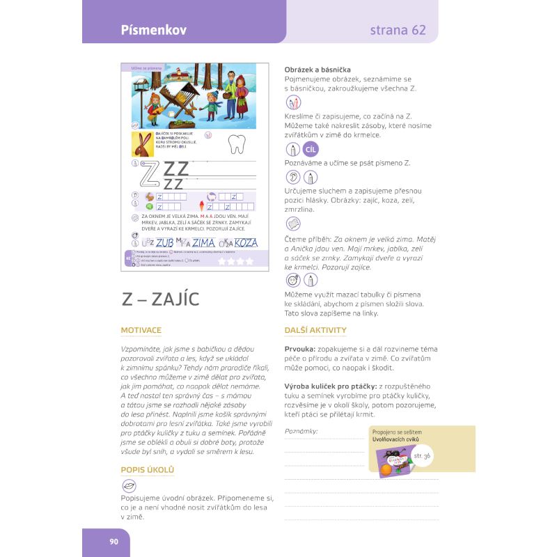 Zařazeny jsou také náměty a aktivity, jak v různých fázích u dětí rozvíjet předčtenářské dovednosti, čtenářské dovednosti i grafomotoriku.