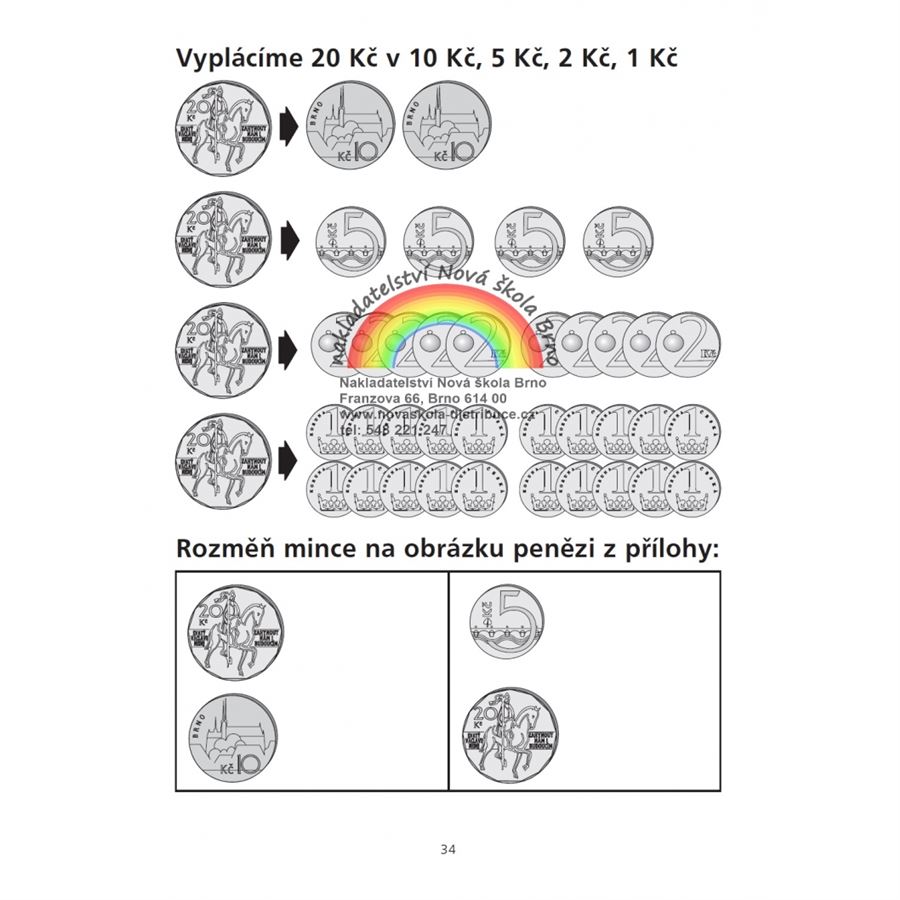 Kromě běžného počítání zahrnuje příklady, se kterými se dítě setkává v každodenním životě (vážení, měření délky, placení penězi apod.), rozklady čísel. Doplněno kartou s penězi.