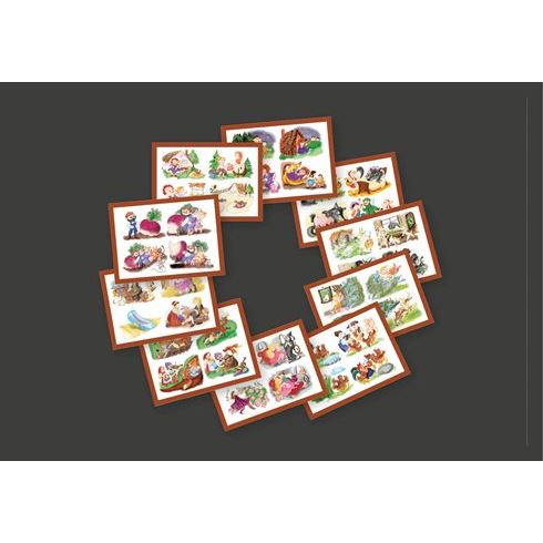 Sada obsahuje 10 kusů pohádkových karet (O Budulínkovi, O Smolíčkovi, O kohoutkovi a slepičce, O Červené Karkulce, O neposlušných kůzlátkách, Perníková chaloupka, O Popelce, O veliké řepě, Šípková Růženka, Hrnečku vař!)