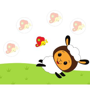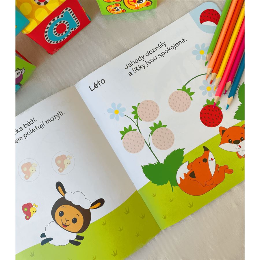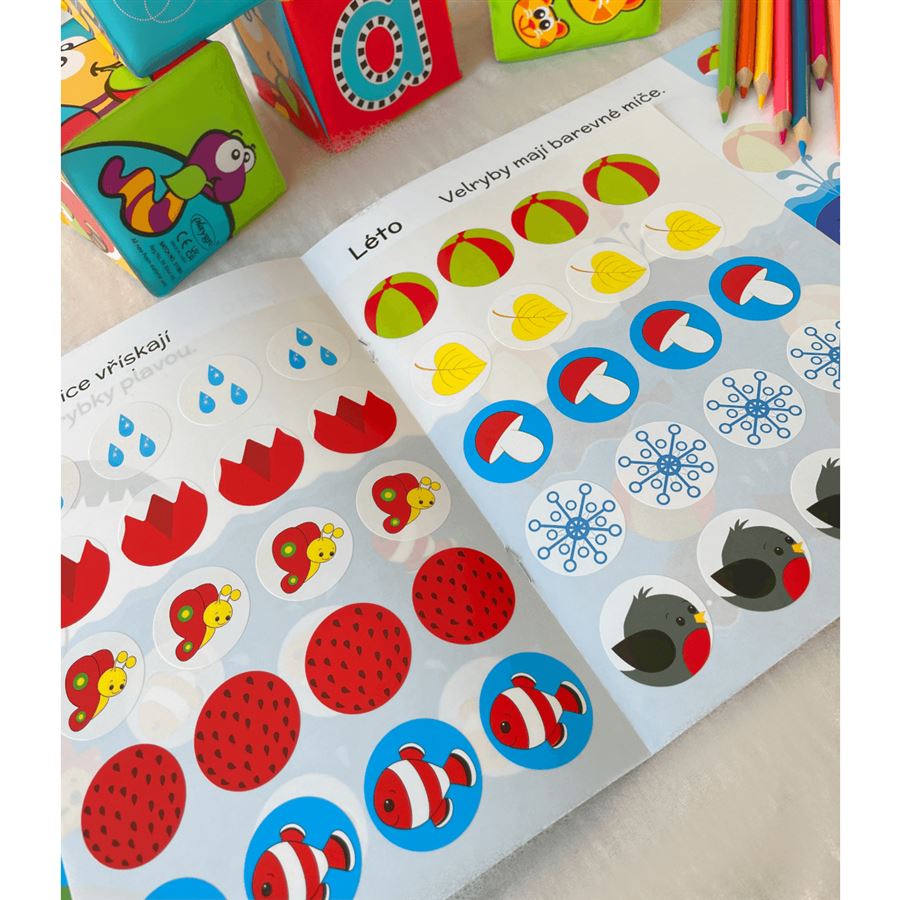 Na každé straně je zobrazeno zvířátko při veselé činnosti typické pro určité roční období a vzorový kulatý obrázek. Dítě musí mezi samolepkami nalézt správnou nálepku a nalepit je na volná místa u ilustrace.