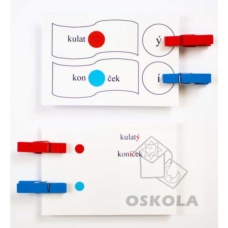 Doplňovačky, diktáty a další pravopisná cvičení se někdy pro děti stávají naprosto nezajímavými a nezáživnými. Naše sady Kolíčky a pravopis mohou velmi zábavnou formou procvičovaní pravopisných jevů ulehčit. Na kartičce jsou vždy dvě slova k doplnění. Úkolem je umístit kolíček na správnou slabiku, písmenko nebo i/y . Po otočení kartičky si děti mohou zkontrolovat správnou odpověď. Sady obsahují velké množství kartiček k důkladnému procvičení.