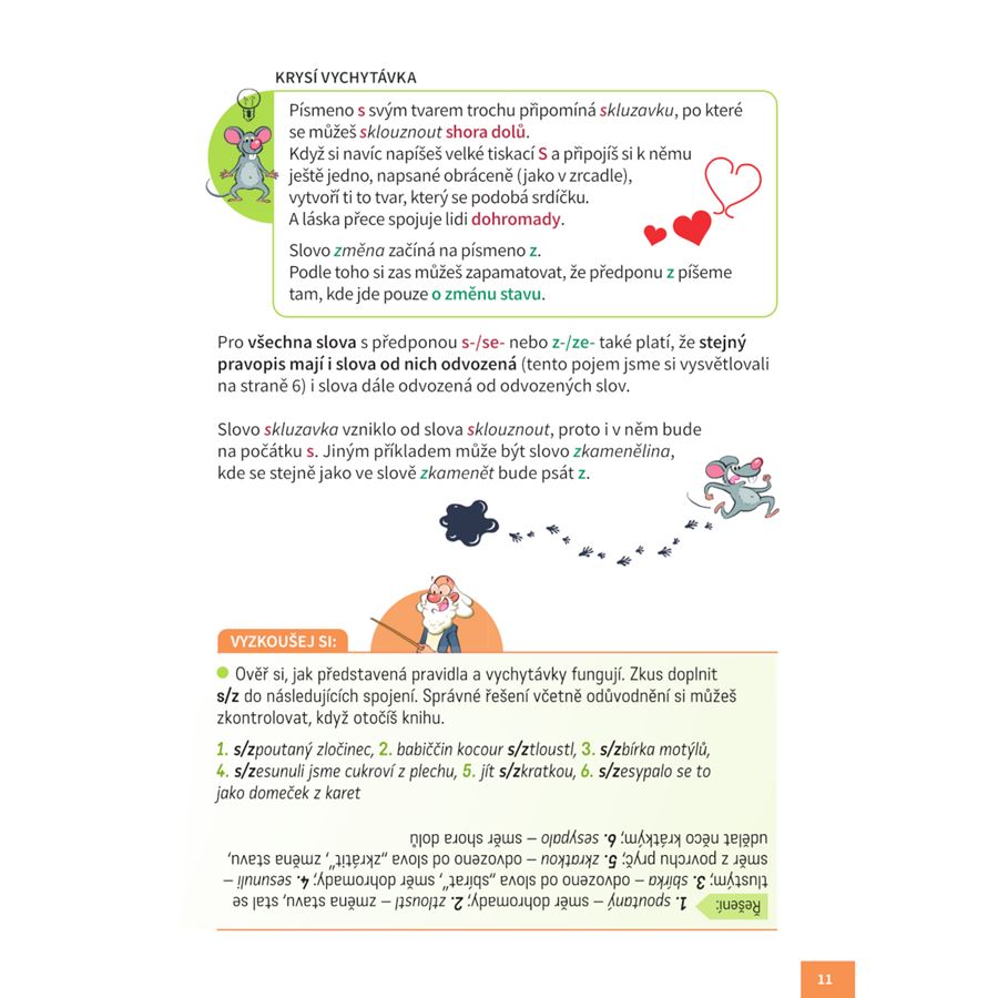 Profesor a jeho malá, ale chytrá pomocnice vám přiblíží nejen pravidla, ale také jednoduché vychytávky, díky kterým si je snadno zapamatujete. Přemýšleli jste někdy, jestli jste právě shlédli nebo zhlédli svůj oblíbený film? Tápete, jak správně poznat základové slovo a určit předponu? Nejste si jistí, kdy psát velké písmeno u názvů? Nebojte se! Na všechno existuje srozumitelné vysvětlení, které vám profesor s krysou naservírují tak, že si ho zapamatujete raz dva!