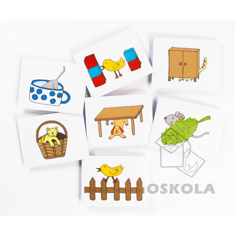 16 kartiček k procvičování předložek na, pod, vedle, mezi, v, do, na, za... Na každém obrázku je vždy zvířátko vyobrazeno tak, aby dítě lehce poznalo jakou předložku použít.