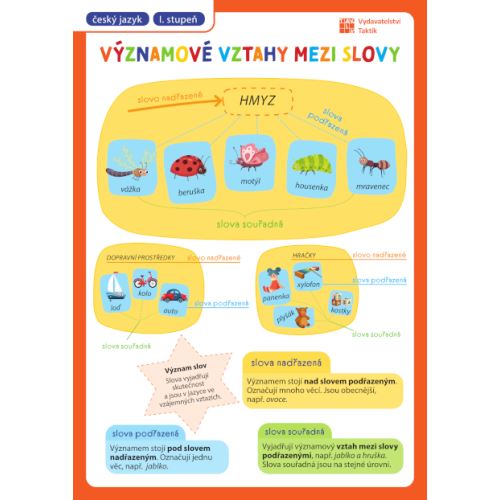 Přehledová tabulka: Významové vztahy mezi slovy, synonyma, antonyma, homonyma pro 1. stupeň základní školy, v jedné tabulce, která se vejde do každého sešitu či notýsku. Tento bohatě ilustrovaný a přehledný malý pomocník se hodí všem, bez ohledu na to, jestli je to školák, nebo ne.