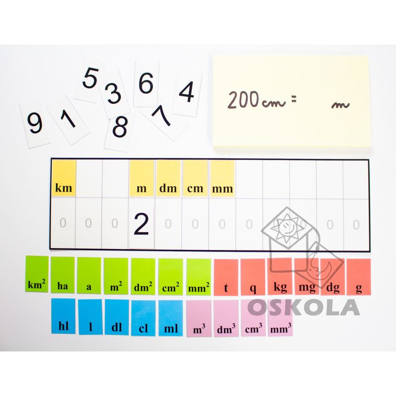 Sada obsahuje jednotky délky, obsahu, objemu, hmotnosti. Každá skupina jednotek má jinou barvu.