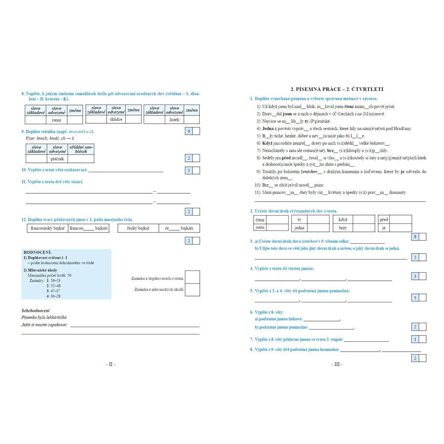 Uprostřed pracovního sešitu najdete Čtvrtletní písemné práce (str. I–VIII). Tyto strany si můžete ze sešitu vytrhnout a použít je při čtvrtletním hodnocení žáků.