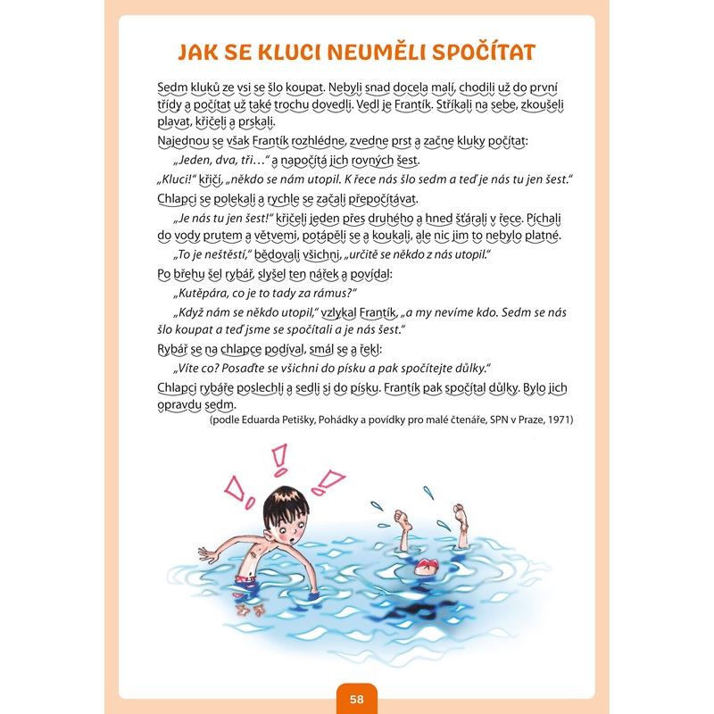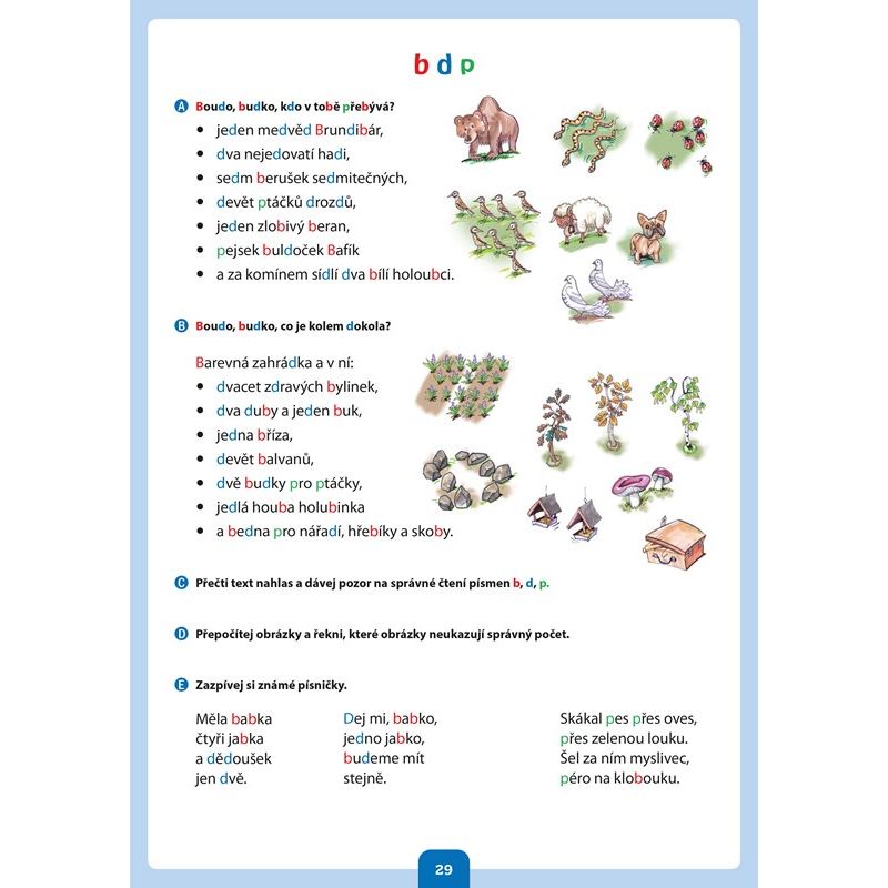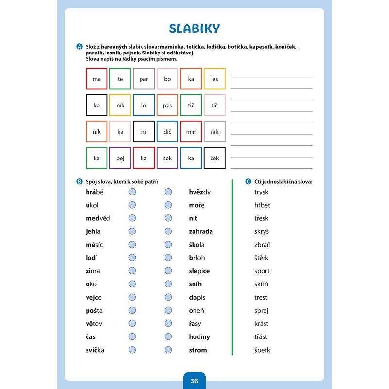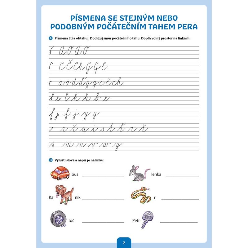 Kniha je určena nejmladším žákům přibližně od 7 let a nabízí řadu podkladů pro procvičení čtení a psaní. První část knihy se věnuje psaní, vnímání tvarů jednotlivých písmen a jejich porovnávání. Při čtení se klade důraz na porozumění textu a žáci jsou motivováni ke koncentraci pozornosti. Materiály k procvičování jsou pestré po obsahové stránce, snaží se děti zaujmout a doplňují je veselé ilustrace.